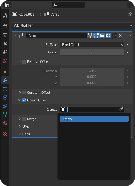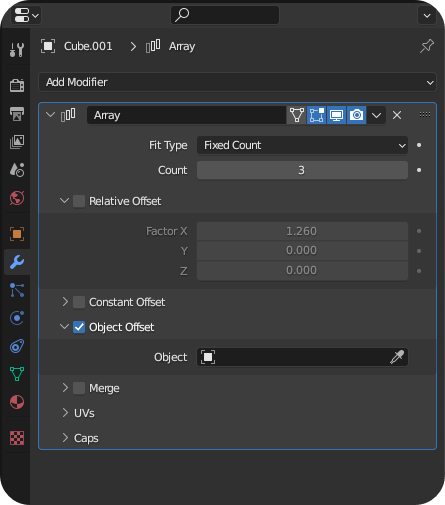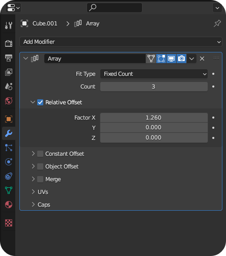 하나의 오브젝트를 만들어, Modifier 탭에 들어가 Array를 추가해준다. Array의 디폴트 값은 위와 같은데 아래와 같이 적용해준다.