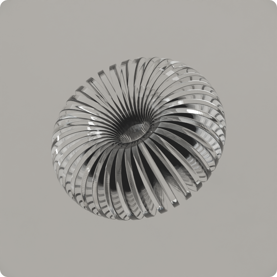 Array의 개수를 36개, Empty 오브젝트의 각도를 10으로 하고, 큐브의 면을 나눈 후 Subdivision 값을 주어 둥글게 변형하였다. 에디터 모드에서 점, 선, 면의 거리를 원점에 가깝게 하여 Array로 만들 수 있는 모양을 제작해 보았다. 위는 HDRI 배경에 Array로 만든 도형을 유리 질감으로 제작해 만든 샘플 컷.