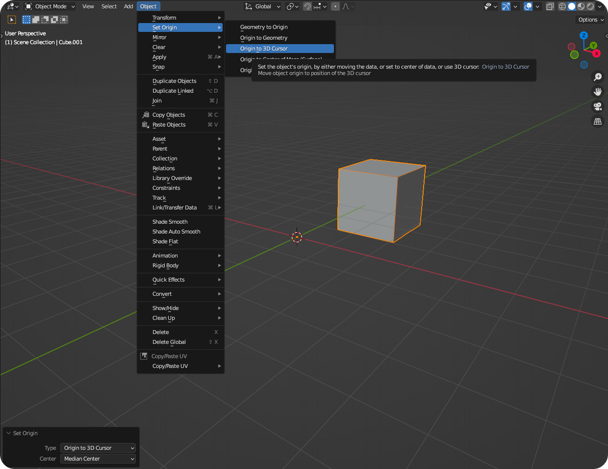 왼쪽 큐브는 회전을 할 때 큐브의 중심점을 기준으로 회전-크기-이동을 조절하지만 오른쪽 큐브는 Y축으로 밀고 원점을 글로벌 기준 0,0,0으로 맞춰 그 지점을 기준으로 회전-크기-이동이 조절된다.