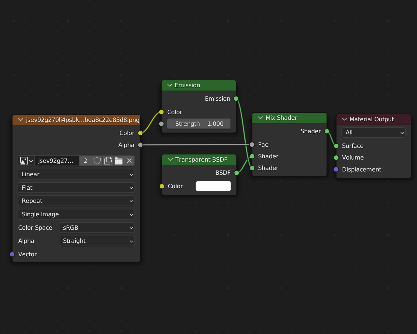 마지막으로 촛불을 만들어보자. 만들어둔 심지에 Plain을 위치시킨다. 촛불 이미지는 구글 검색 및 관련 에셋을 받아와서 사용했으며 촛불을 제외한 배경은 투명한 PNG 등의 이미지를 활용하는 것이 좋다. 촛불은 텍스쳐 작업으로 만들 수 있는데 노드 구성은 다음과 같다. 기본 재질을 삭제하고 다운로드해 둔 PNG 이미지를 불러온다. Emission 노드와 Transparent 노드를 Mix 해 아래와 같이 사용하면 촛불의 이미지만 남고 배경은 투명이 된다.