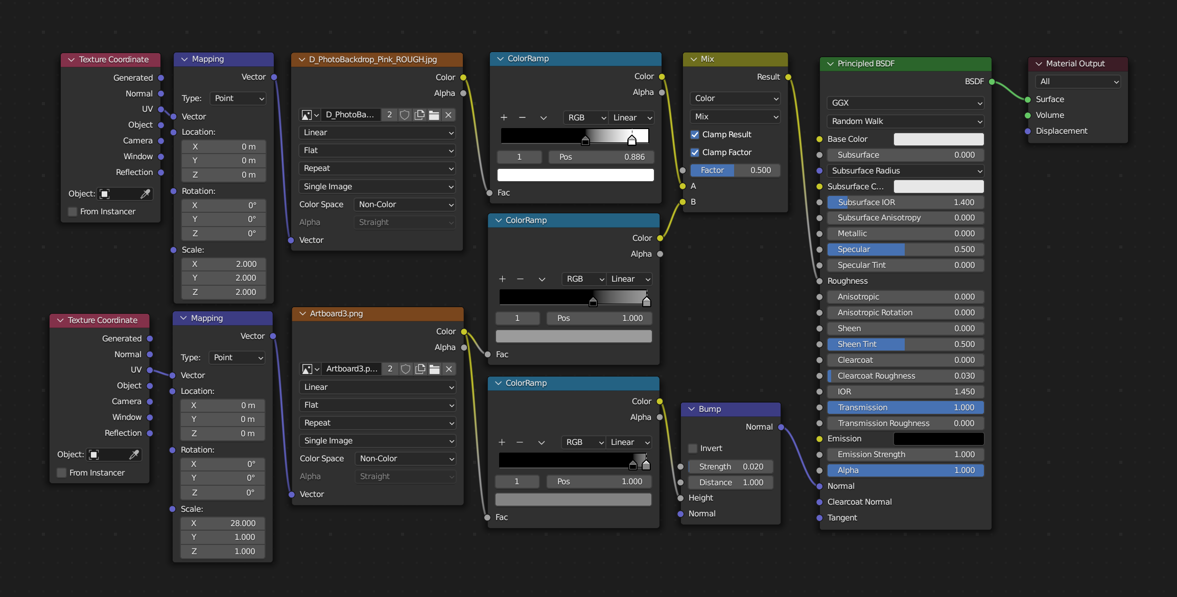 Bump만으로는 자연스러운 이미지를 만들기 어려워 같은 이미지를 Roughness에도 활용했으며, Bump와 Roughness 각각 Ramp를 연결해 값을 조정해서 맘에 드는 이미지 결과 값을 만들어낼 수 있었다. 두 번째 이미지를 활용하기 위한 노드 구조는 다음과 같다.