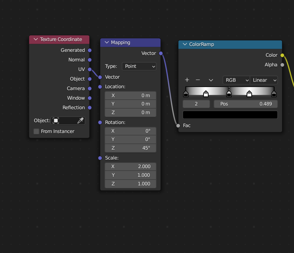 Color Ramp에 마크를 추가해 가운데를 블랙으로, 양옆을 화이트로 두고 Mapping과 Coordinate를 활용해 대각선으로 휘어져 있는 이미지를 수직으로 설 수 있도록 구성했다. Scale값을 보면 알겠지만 Color Ramp의 흰색과 검은색의 분포가 하나의 맵으로 Scale값을 조정할수록 Color Ramp의 패턴이 늘어나는 식으로 구성되는 것이 아닌 것으로 보인다. 현상태에서 패턴을 늘리려면 Ramp의 마크를 더 찍어 일일이 흑과 백으로 조정해 주는 방법으로 가능하나, 그것은 너무나 비효율적인 방법이다. Ramp의 마크를 통해 만들어내는 그라디언트는 이미지 텍스쳐와 같은 방식으로 통제되지 않는 것으로 보인다.