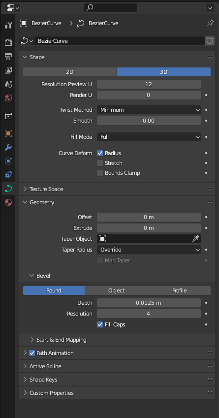불러온 Path는 닫힌 상태로 오며 Object Data Properties에서 Extrude, Bevel을 조절할 수 있다. 판때기를 만들었으니 그 위에 네온사인 같은 조명을 붙이려고 한다. 이것 역시 Path로 만들 것이다.