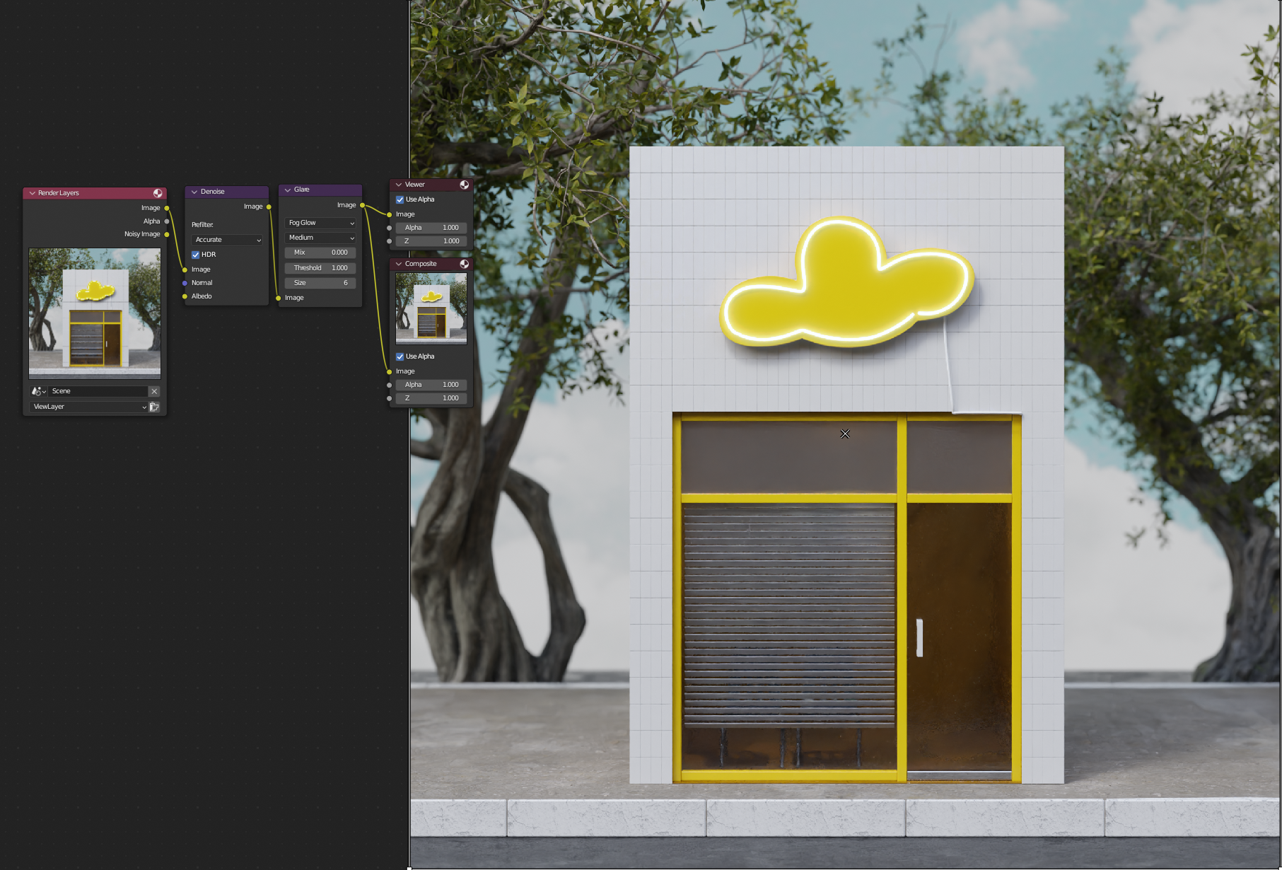 바닥은 Dirt map 2개를 섞어 최종적으로는 아스팔트 바닥처럼 보이도록 제작했고, 네온사인처럼 보이길 원했던 Path는 Emission 노드 하나만 활용하였다. 전체적인 환경은 HDRI를 약하게 적용시킨 후 Area 라이트를 보충해 주었고, Compositing 에디터에서 Glare 효과를 추가해 빛이 더 부드럽게 퍼져 보이도록 수정했다.