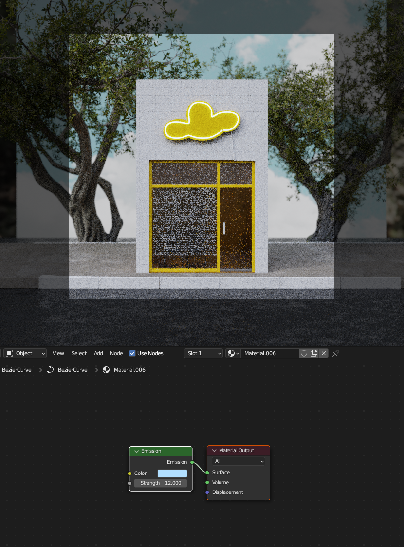 타일 텍스쳐가 아닌 Modifier와 Instance를 활용해 타일을 깔아 간단한 건물을 만들어보았다. 날이 풀리고 있는데, 얼른 봄이 왔으면 좋겠다는 마음을 담아 장면을 완성해 보았다. 네온처럼 얇은 원기둥의 선에 Emission 노드를 활용해 빛을 주어 간판을 만들었고, 의자와 나무는 Poly Haven 에셋을 활용했다. 약간 비현실적으로 보일지 모르지만 연극의 세트장처럼 뒷 배경은 카메라에 가득 찰 만큼의 Plain과 이미지를 활용한 Emission으로 배경을 만들어주었다. 이번 포스팅에서는 최종 장면을 만들기까지의 과정을 정리해 보았다.
