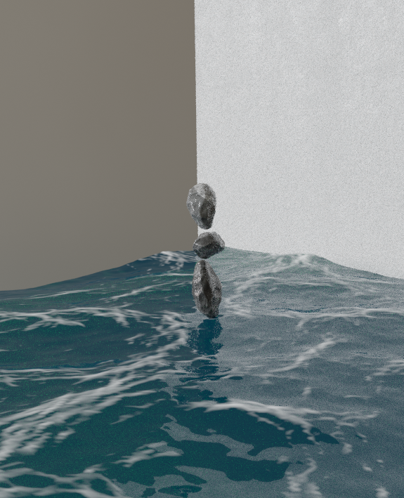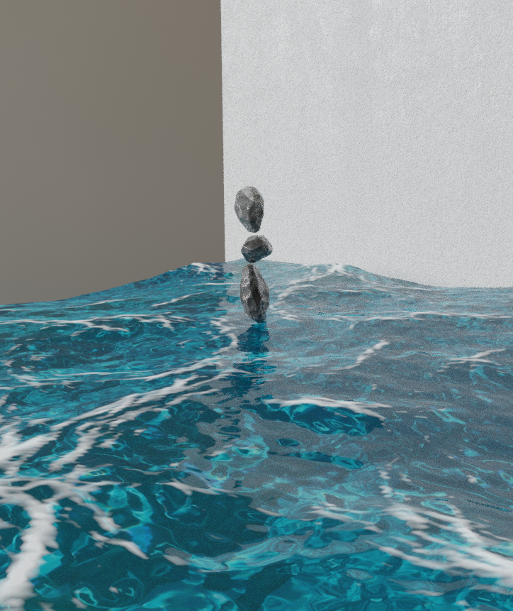 이제 원하는 모양으로 모델링을 마무리하고 바닥, 벽, 빛을 구성해 장면을 연출했다. 바닥은 바다와 같은 파도치는 표면으로 만들기 위해 Plain을 깔고 Ocean을 적용해 주었다. Resolution을 충분히 올려준 후에 Foam을 체크해 주었다. Data Layer에 Foam이라고 적어두면 텍스쳐 작업을 할 때 파도가 하얗게 부서지는 부분을 표현할 때 요긴하게 쓸 수 있다.