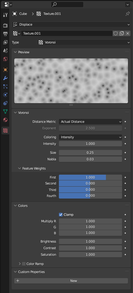 큐브를 선택하고 Modifier Properties 탭으로 들어가면, 탭 상단에 Add Modifier를 통해 Displace를 적용할 수 있다. New를 누르면 Displace가 적용할 Texture가 새로 만들어진다. Texture는 아무것도 없는 이미지가 디폴트로 되어있기에 큐브에 아무런 변형을 가하지 못한다. 여기에 Noise를 적용하면 Noise의 BW 값이 큐브를 변형시킨다. 단, Noise를 통해 큐브의 형태가 변형되기 위해서는 면이 충분히 나눠질 필요가 있다. 따라서 Displace와 Subdivision Surface를 둘 다 적용하고, Subdivision Surface를 위로, Displace를 아래에 두도로 한다.