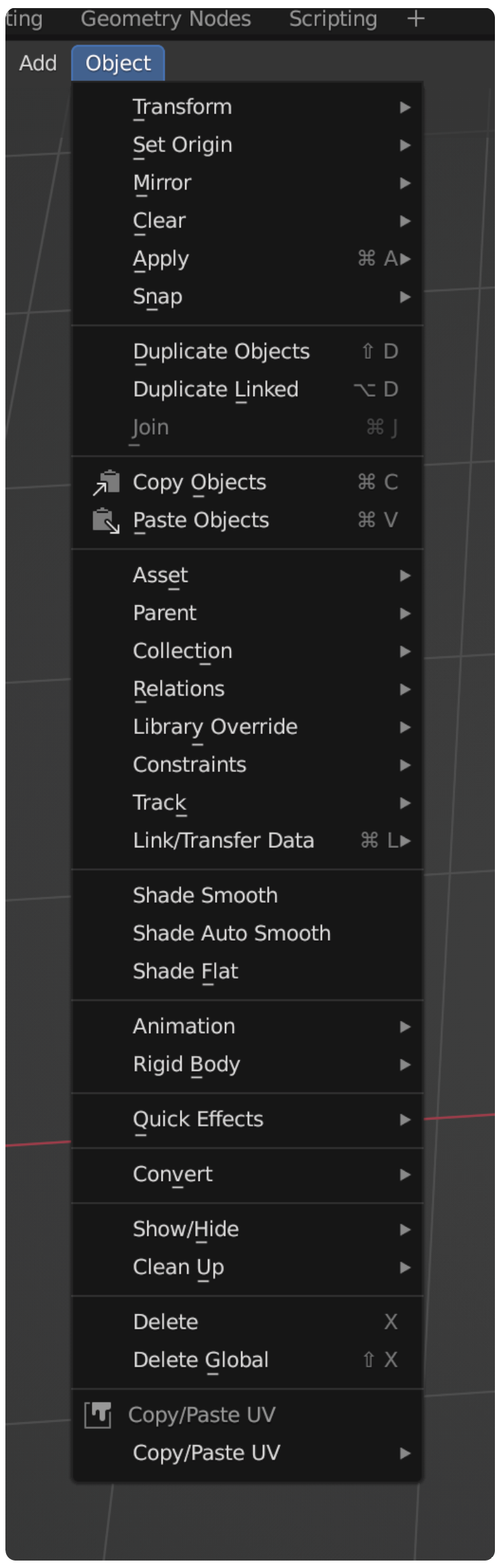 Object Transform : 오브젝트의 이동, 회전, 크기 등 조절 Set Origin : 오브젝트의 중심점 조정 Mirror : 다양한 옵션의 미러 조정 Clear : 현재 위치, 크기, 각도를 원점으로 조정 Apply : - Snap : 스냅 옵션 조정 Duplicate Objects : 오브젝트 복제 Duplicate Linked : 오브젝트 데이터 없이 복제 Join : 다른 오브젝트를 하나로 병합 Copy/Paste Objects : 클립보드에서 오브젝트 복제 Asset : 에셋 설정 및 클리어 Parent : 다양한 옵션으로 패런팅 실행 Collection : 콜랙션 추가 제거 및 기타 옵션 Relations : - Library Override : - Constraints : - Track : 트랙 설정 Link/Transfer Data : - Shade Smooth : 뷰포트에서 쉐이드 부드럽게 처리 Shade Auto Smooth : 뷰포트에서 쉐이드 부드럽게 자동처리 Shade Flat : 뷰포트에서 쉐이드 단순처리 Animation : 키프레임 관련 실행 및 베이크 Rigid Body : 리지드 바디 실행 및 옵션 Quick Effects : 털, 폭발, 연기, 물 효과 Convert : 변환 옵션 Show/Hide : 오브젝트 가리고 끄기 Clean Up : 버텍스 웨이트 삭제 및 제한 설정 Delete : 오브젝트 삭제 Delete Global : 오브젝트 삭제 Copy/Paste UV : - |
